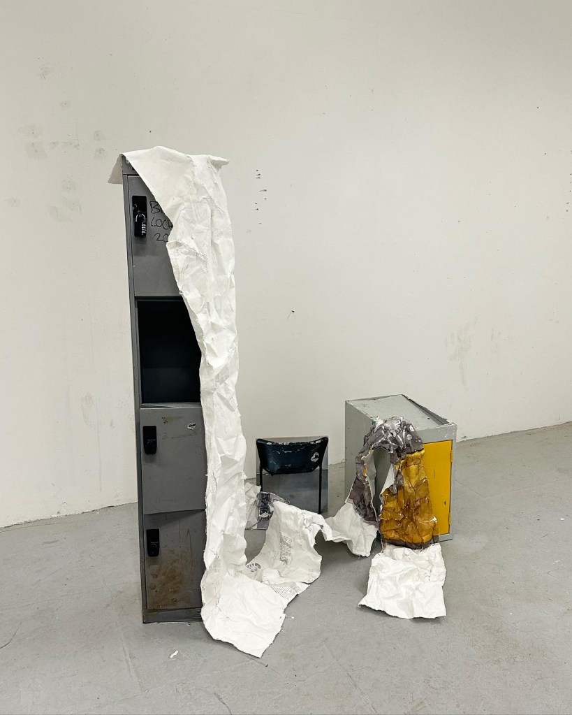 Transferring 2D to 3D and 3D to 2D to represent today that due to too much of dependence on media world, truth and false switched, confused, and beyond that it doesn’t even matter know. Tricking people to think plaster as a paper and to think printing as real objects and at the same time showing how it is easy to make people trust. The crumpled paper holds presence in reality, while the locker, firm in appearance, is merely a fragile sheet.